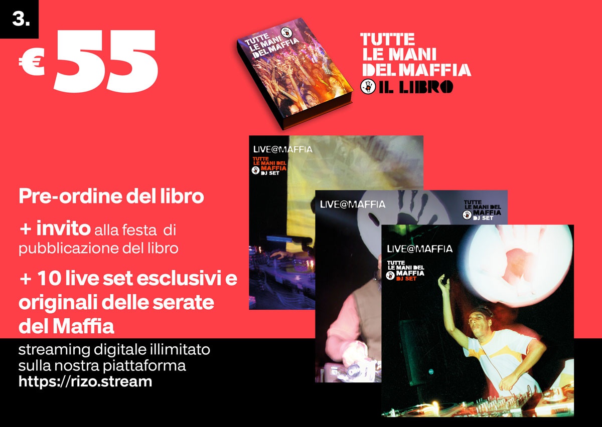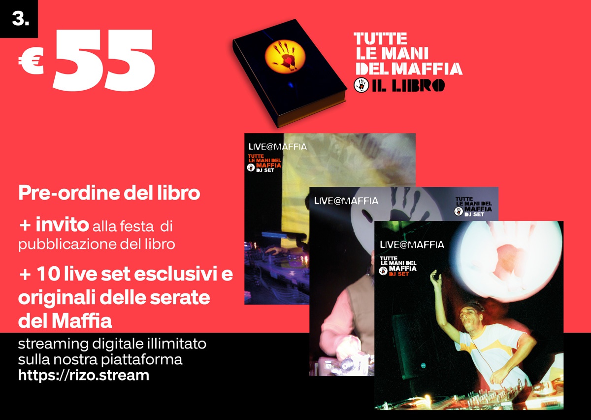 Pre-ordine del libro + invito alla festa di pubblicazione del libro+ 10 live set esclusivi e originali delle serate del Maffia in streaming digitale illimitato sulla nostra piattaforma Rizostream (https://rizo.stream/)