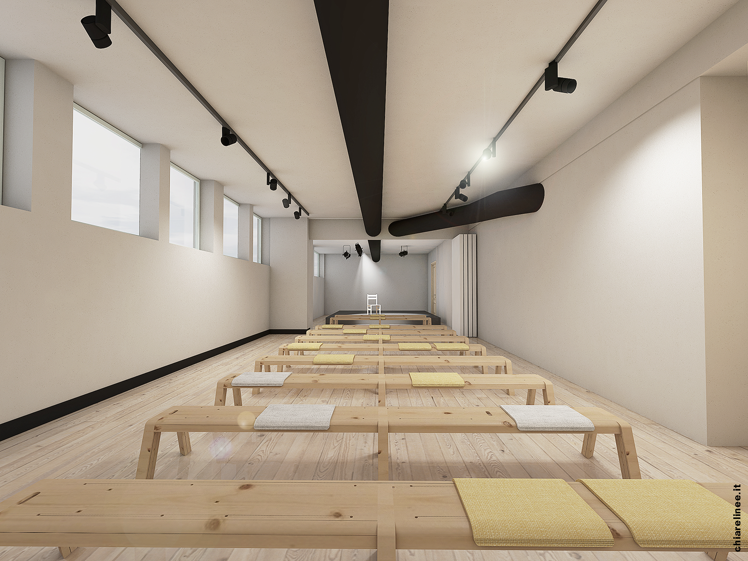 Il progetto prevede la realizzazione di 4 nuove aule, aree dedicate a spogliatoio, servizi disabili, un confortevole spazio di accoglienza e segreteria, una sala di registrazione, una zona relax e snack, una biblioteca teatrale e uno spazio per la lettura ad accesso gratuito per tutti, ampi uffici, una zona archivio e costumeria. Dovremo inoltre realizzare un nuovo impianto di climatizzazione, aerazione e di ricircolo dell’aria.