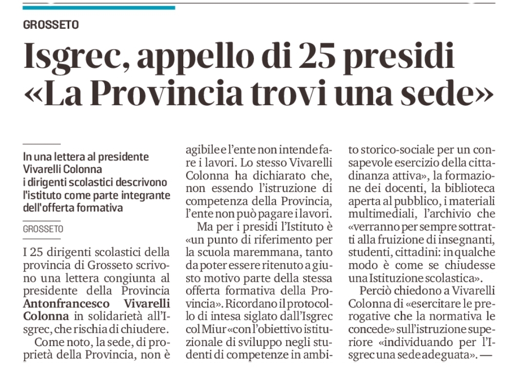 I dirigenti scolastici della provincia di Grosseto: "L’Istituto nei suoi molti anni di attività ha saputo diventare un punto di riferimento per la scuola maremmana, tanto da poter essere ritenuto a giusto motivo parte della stessa offerta formativa della Provincia di Grosseto. L’Isgrec, quale partecipante alla rete degli Istituti per la Storia della Resistenza e dell’età contemporanea, ha siglato un protocollo di intesa con il Miur con l’obiettivo istituzionale di sviluppo negli studenti di competenze in ambito storico-sociale per un consapevole esercizio della cittadinanza attiva.