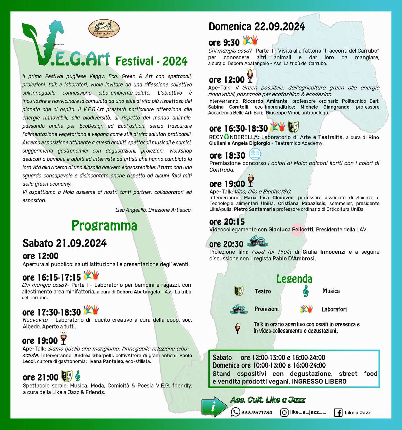 Il Festival V.E.G.Art 2025, alla sua seconda edizione, è un evento con spazi espositivi, dibattiti con esperti, spettacoli a tema e laboratori per piccoli e grandi pensato per promuovere tematiche ambientali legate al vegetarianismo, veganismo, ecologia e sostenibilità verde, combinando questi temi con espressioni artistiche. L’acronimo è V. = (veggie & vegan); E. (=eco); G. (=green), + spettacoli Artistici, Art (=arte).